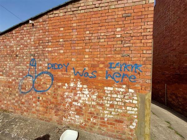 The wall was damaged on sometime on Friday 3rd April where unknown person(s) have sprayed blue spray paint over the wall; I have attached an image of the damage.