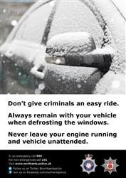 Winter Crime Prevention Advice It is that time of the year again Get ready for some cold temperatures. It is expected to drop below -7 -8 in places overnight. Do not let the thieves take advantage of you leaving your car defrosting on your drive. Beware of car thieves whilst defrosting your vehicle! CRIME PREVENTION ADVICE FOR FROSTY MORNINGS Protect your frost covered vehicles from opportunist thieves. Northamptonshire Police would like to remind motorists not to leave their vehicles with the keys in the ignition while the vehicles defrost. Thieves are known to target residential areas on cold and frosty mornings looking for cars where the owner has started the engine to defrost the windscreen and then returned inside, leaving the car unattended. • If you have a garage, always put the car away at night. This not only keeps the car frost-free but also out of sight of would-be car thieves. • Always remove keys from the ignition, even if you are leaving your car, just to open a garage door. It only takes a thief a few seconds to jump in and drive away. • Cover your windscreen the night before a frost is forecast. This will shorten the amount of time it takes to clear the windscreen. • Ensure you have the required de-icing materials available. • Stay with your car while it is defrosting. You may even consider taking a cup of tea out with you while you wait. • Make sure you allow yourself longer in the morning to get ready if frost or snow has been forecast the night before. • Motorists should also be aware that some motor insurance policies become invalid, or the cover reduced, if a car is stolen because of keys being left in the ignition. Following the above advice will help protect yourself, your vehicle(s) and others from harm on our roads this winter.
